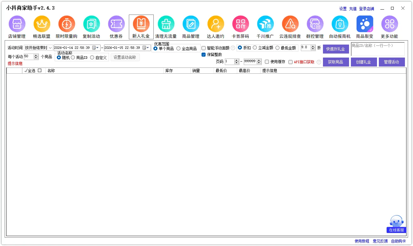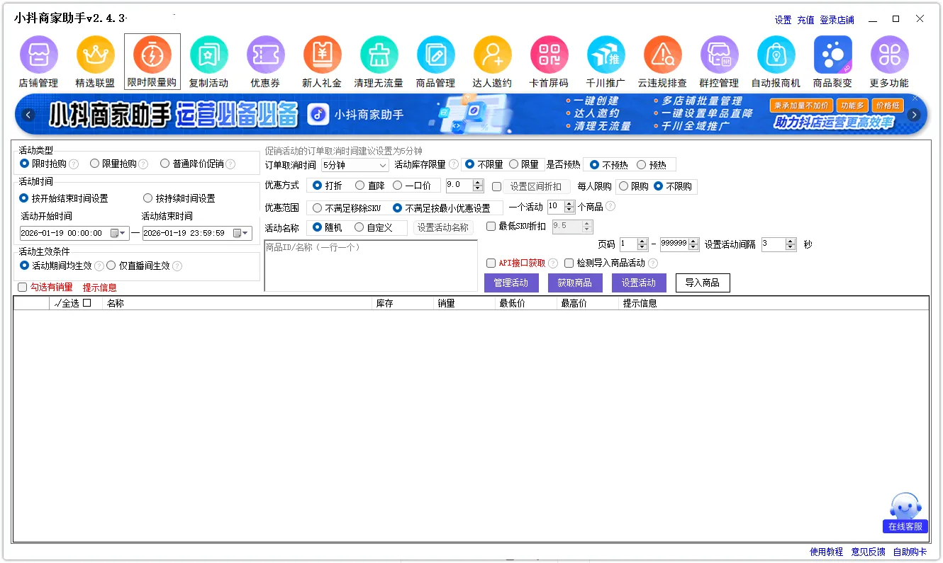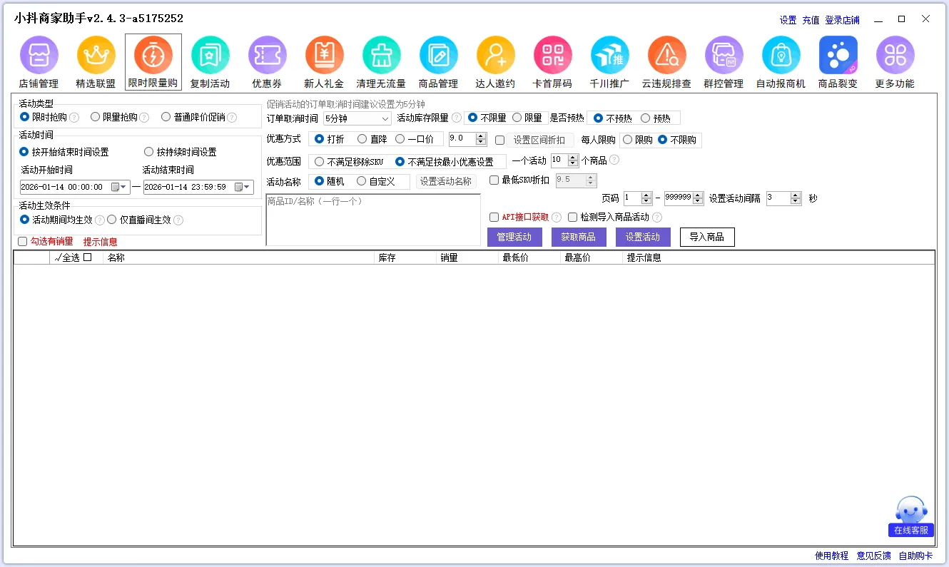折扣、指定商品、限制数量,都在那儿。折扣填进去的时候心里其实有点虚,毕竟是直接影响价格,但小抖商家助手这里会把最低价、最高价都列出来,看着心里有底一点。